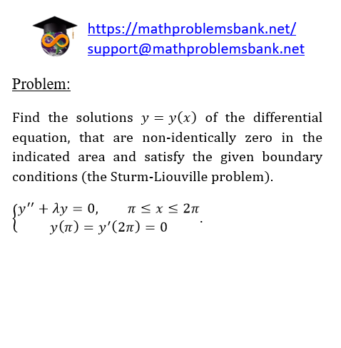 Problem: Find the solutions \( y=y(x) \) of the differential equation, that are non-identically zero in the indicated area and satisfy the given boundary conditions (the Sturm-Liouville problem). \[ \left\{\begin{array}{c} y^{\prime \prime}+\lambda y=0, \quad \pi \leq x \leq 2 \pi \\ y(\pi)=y^{\prime}(2 \pi)=0 \end{array} .\right. \]
