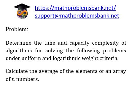 Problem: Determine the time and capacity complexity of algorithms for solving the following problems under uniform and logarithmic weight criteria. Calculate the average of the elements of an array of \( n \) numbers.