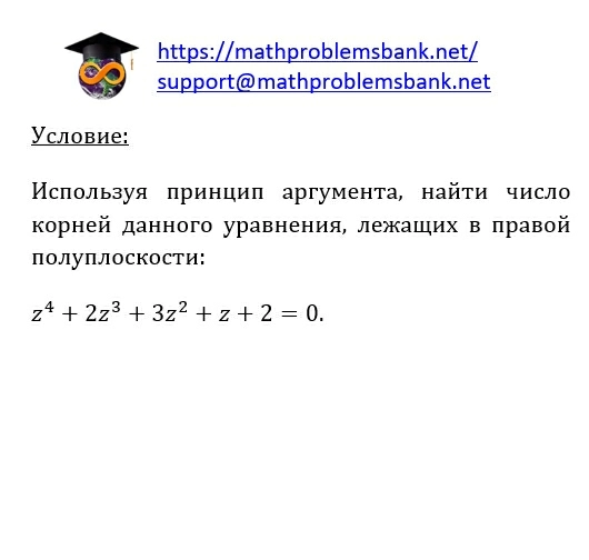 Условие: Используя принцип аргумента, найти число корней данного уравнения, лежащих в правой полуплоскости: \[ z^{4}+2 z^{3}+3 z^{2}+z+2=0 \]
