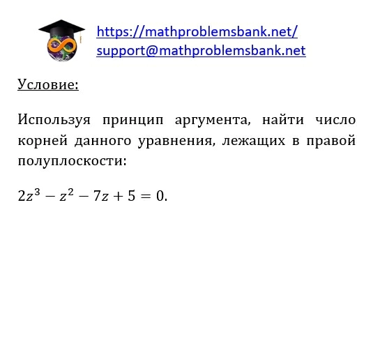 Условие: Используя принцип аргумента, найти число корней данного уравнения, лежащих в правой полуплоскости: \[ 2 z^{3}-z^{2}-7 z+5=0 \]