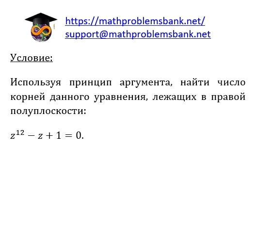 условие: Используя принцип аргумента, найти число корней данного уравнения, лежащих в правой полуплоскости: \[ z^{12}-z+1=0 \]