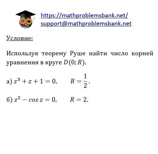 \( \underline{\mathrm{y}_{\text {словие: }}} \) Используя теорему Руше найти число корней уравнения в круге \( D(0 ; R) \). a) \( z^{3}+z+1=0, \quad R=\frac{1}{2} \) б) \( z^{2}-\cos z=0, \quad R=2 \)