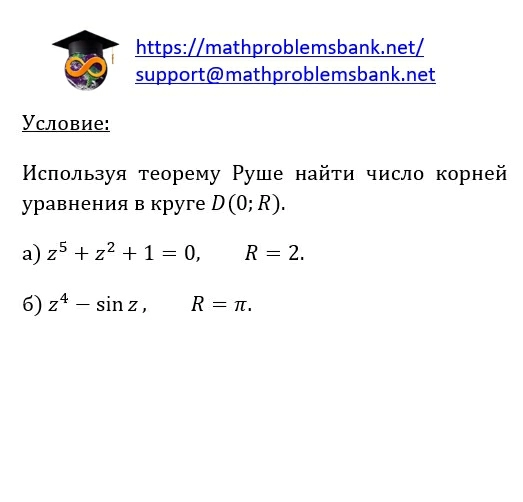 условие: Используя теорему Руше найти число корней уравнения в круге \( D(0 ; R) \). a) \( z^{5}+z^{2}+1=0, \quad R=2 \). б) \( z^{4}-\sin z, \quad R=\pi \)