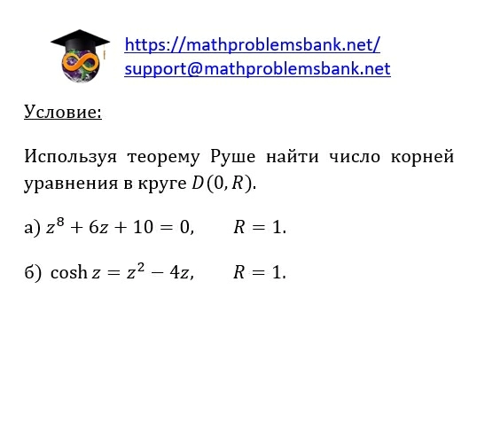 Условие: Используя теорему Руше найти число корней уравнения в круге \( D(0, R) \). a) \( z^{8}+6 z+10=0, \quad R=1 \). б) \( \cosh z=z^{2}-4 z, \quad R=1 \).