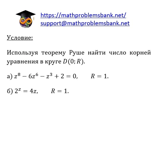Условие: Используя теорему Руше найти число корней уравнения в круге \( D(0 ; R) \). a) \( z^{8}-6 z^{6}-z^{3}+2=0, \quad R=1 \). б) \( 2^{z}=4 z, \quad R=1 \)