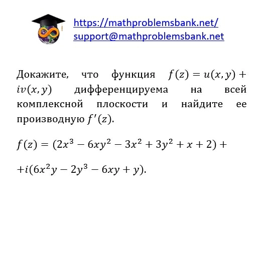 Докажите, что функция \( f(z)=u(x, y)+ \) \( i v(x, y) \) дифференцируема на всей комплексной плоскости и найдите ее производную \( f^{\prime}(z) \). \[ \begin{array}{l} f(z)=\left(2 x^{3}-6 x y^{2}-3 x^{2}+3 y^{2}+x+2\right)+ \\ +i\left(6 x^{2} y-2 y^{3}-6 x y+y\right) . \end{array} \]