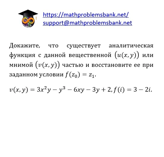 Докажите, что существует аналитическая функция с данной вещественной \( (u(x, y)) \) или мнимой \( (v(x, y)) \) частью и восстановите ее при заданном условии \( f\left(z_{0}\right)=z_{1} \). \[ v(x, y)=3 x^{2} y-y^{3}-6 x y-3 y+2, f(i)=3-2 i . \]