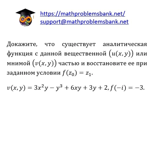 Докажите, что существует аналитическая функция с данной вещественной \( (u(x, y)) \) или мнимой \( (v(x, y)) \) частью и восстановите ее при заданном условии \( f\left(z_{0}\right)=z_{1} \). \[ v(x, y)=3 x^{2} y-y^{3}+6 x y+3 y+2, f(-i)=-3 \text {. } \]
