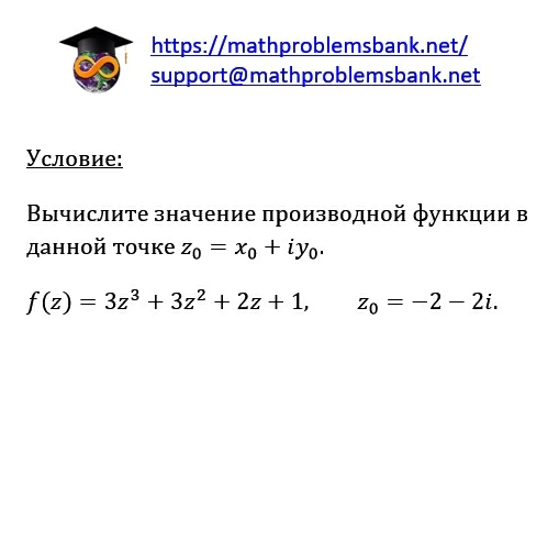 Условие: Вычислите значение производной функции в данной точке \( z_{0}=x_{0}+i y_{0} \). \[ f(z)=3 z^{3}+3 z^{2}+2 z+1, \quad z_{0}=-2-2 i . \]