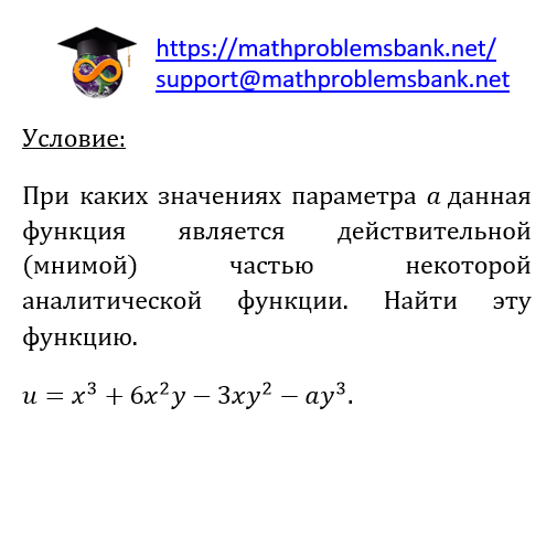 Условие: При каких значениях параметра а данная функция является действительной (мнимой) частью некоторой аналитической функции. Найти эту функцию. \[ u=x^{3}+6 x^{2} y-3 x y^{2}-a y^{3} \]