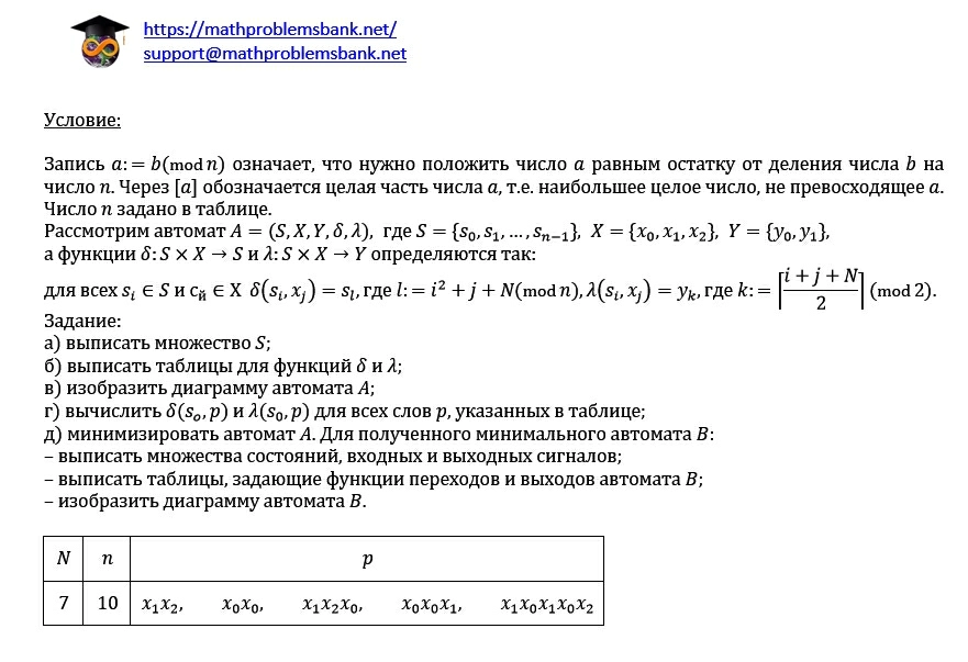 условие: Запись \( a:=b(\bmod n) \) означает, что нужно положить число \( a \) равным остатку от деления числа \( b \) на число \( n \). Через \( [a] \) обозначается целая часть числа \( a \), т.е. наибольшее целое число, не превосходящее \( a \). Число \( n \) задано в таблице. Рассмотрим автомат \( A=(S, X, Y, \delta, \lambda) \), где \( S=\left\{s_{0}, s_{1}, \ldots, s_{n-1}\right\}, X=\left\{x_{0}, x_{1}, x_{2}\right\}, Y=\left\{y_{0}, y_{1}\right\} \), а функции \( \delta: S \times X \rightarrow S \) и \( \lambda: S \times X \rightarrow