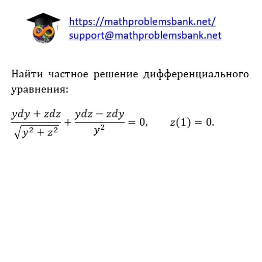 Найти частное решение дифференциального уравнения: \[ \frac{y d y+z d z}{\sqrt{y^{2}+z^{2}}}+\frac{y d z-z d y}{y^{2}}=0, \quad z(1)=0 \]