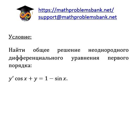 условие: Найти общее решение неоднородного дифференциального уравнения первого порядка: \[ y^{\prime} \cos x+y=1-\sin x \]