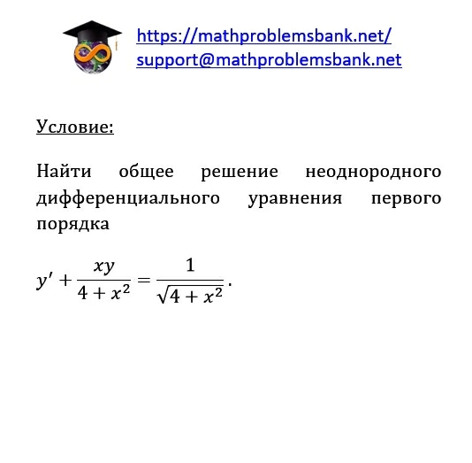 Условие: Найти общее решение неоднородного дифференциального уравнения первого порядка \[ y^{\prime}+\frac{x y}{4+x^{2}}=\frac{1}{\sqrt{4+x^{2}}} \]