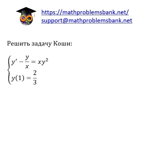 Решить задачу Коши: \[ \left\{\begin{array}{l} y^{\prime}-\frac{y}{x}=x y^{2} \\ y(1)=\frac{2}{3} \end{array}\right. \]