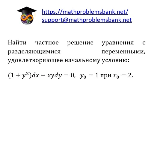 Найти частное решение уравнения с разделяющимися переменными, удовлетворяющее начальному условию: \[ \left(1+y^{2}\right) d x-x y d y=0, \quad y_{0}=1 \text { при } x_{0}=2 \text {. } \]
