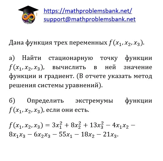 Дана функция трех переменных \( f\left(x_{1}, x_{2}, x_{3}\right) \). a) Найти стационарную точку функции \( f\left(x_{1}, x_{2}, x_{3}\right) \), вычислить в ней значение функции и градиент. (В отчете указать метод решения системы уравнений). б) Определить экстремумы функции \( f\left(x_{1}, x_{2}, x_{3}\right) \), если они есть. \[ \begin{array}{l} f\left(x_{1}, x_{2}, x_{3}\right)=3 x_{1}^{2}+8 x_{2}^{2}+13 x_{3}^{2}-4 x_{1} x_{2}- \\ 8 x_{1} x_{3}-6 x_{2} x_{3}-55 x_{1}-18 x_{2}-21 x_{3} . \end{array} \]