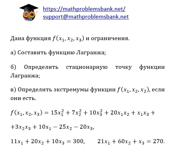 Дана функция \( f\left(x_{1}, x_{2}, x_{3}\right) \) и ограничения. a) Составить функцию Лагранжа; б) Определить стационарную точку функции Лагранжа; в) Определить экстремумы функции \( f\left(x_{1}, x_{2}, x_{2}\right) \), если они есть. \[ \begin{array}{l} f\left(x_{1}, x_{2}, x_{3}\right)=15 x_{1}^{2}+7 x_{2}^{2}+10 x_{3}^{2}+20 x_{1} x_{2}+x_{1} x_{3}+ \\ +3 x_{2} x_{3}+10 x_{1}-25 x_{2}-20 x_{3}, \\ 11 x_{1}+20 x_{2}+10 x_{3}=300, \quad 21 x_{1}+60 x_{2}+x_{3}=270 . \end{array} \]