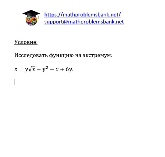 \( \underline{\mathrm{y}_{\text {словие: }}} \) Исследовать функцию на экстремум: \[ z=y \sqrt{x}-y^{2}-x+6 y \]