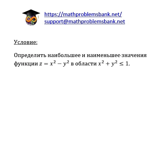 \( \underline{\mathrm{y}_{\text {словие: }}} \) Определить наибольшее и наименьшее значения функции \( z=x^{2}-y^{2} \) в области \( x^{2}+y^{2} \leq 1 \).