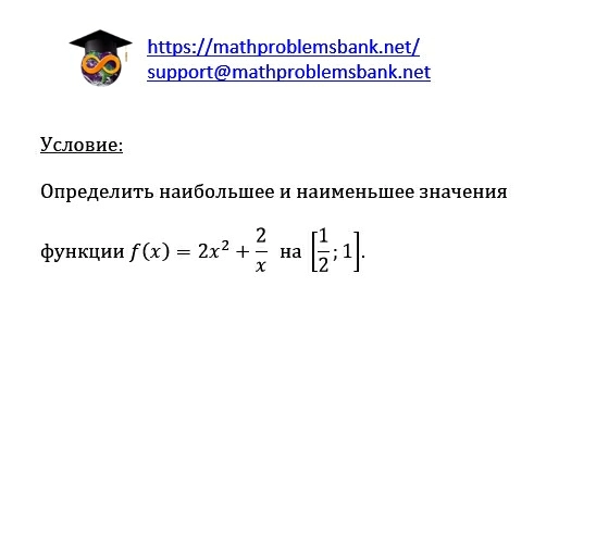 \( \underline{\mathrm{y}_{\text {словие: }}} \) Определить наибольшее и наименьшее значения функции \( f(x)=2 x^{2}+\frac{2}{x} \) на \( \left[\frac{1}{2} ; 1\right] \).