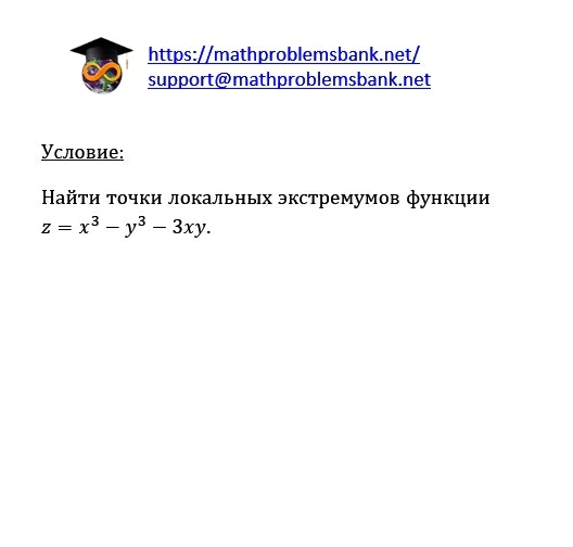 условие: Найти точки локальных экстремумов функции \[ z=x^{3}-y^{3}-3 x y \text {. } \]