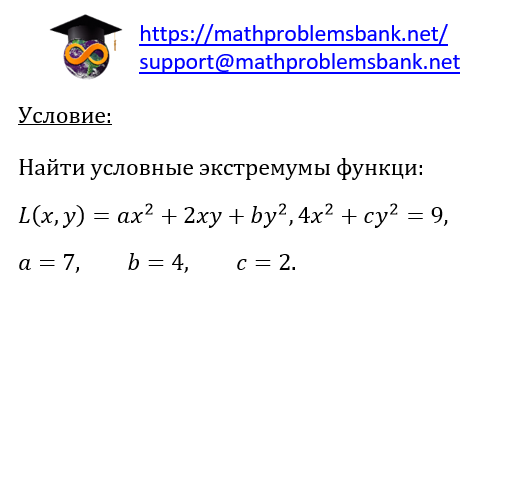 Условие: Найти условные экстремумы функци: \[ \begin{array}{l} L(x, y)=a x^{2}+2 x y+b y^{2}, 4 x^{2}+c y^{2}=9, \\ a=7, \quad b=4, \quad c=2 . \end{array} \]