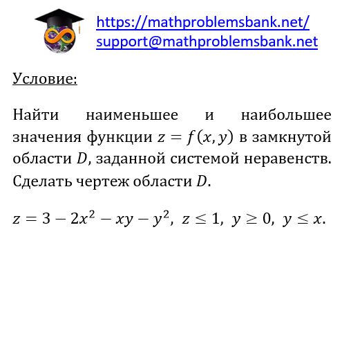 условие: Найти наименьшее и наибольшее значения функции \( z=f(x, y) \) в замкнутой области \( D \), заданной системой неравенств. Сделать чертеж области \( D \). \[ z=3-2 x^{2}-x y-y^{2}, z \leq 1, y \geq 0, y \leq x \]