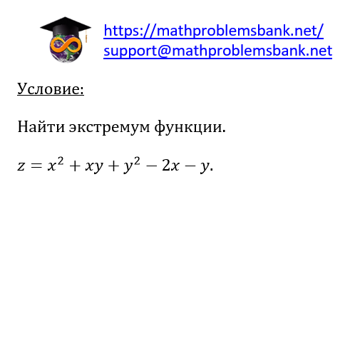 Условие: Найти экстремум функции. \[ z=x^{2}+x y+y^{2}-2 x-y \]