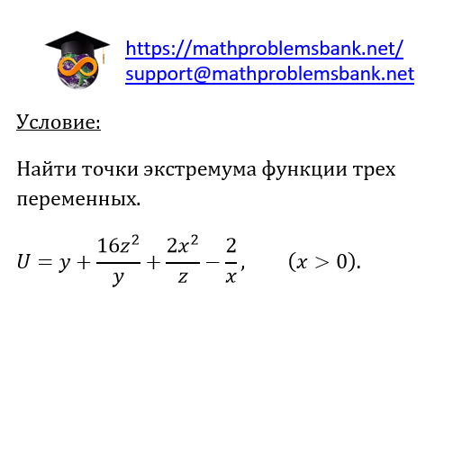 \( \underline{\text { Условие: }} \) Найти точки экстремума функции трех переменных. \[ U=y+\frac{16 z^{2}}{y}+\frac{2 x^{2}}{z}-\frac{2}{x}, \quad(x>0) \]