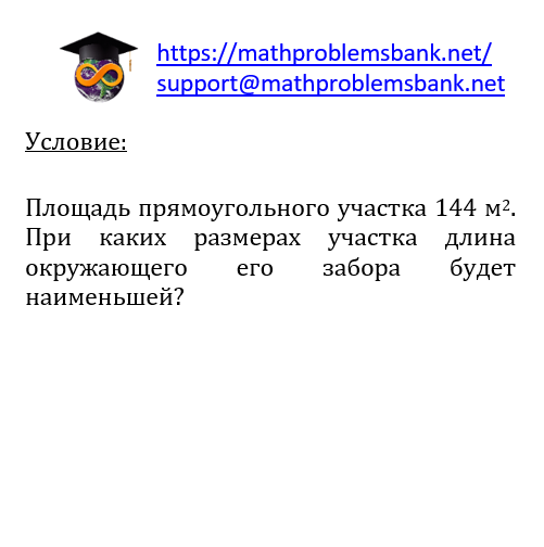 Условие: Площадь прямоугольного участка 144 м\( ^{2} \). При каких размерах участка длина окружающего его забора будет наименьшей?