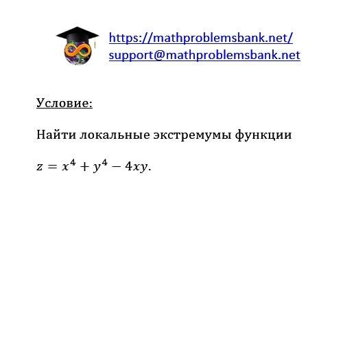 Условие: Найти локальные экстремумы функции \[ z=x^{4}+y^{4}-4 x y . \]