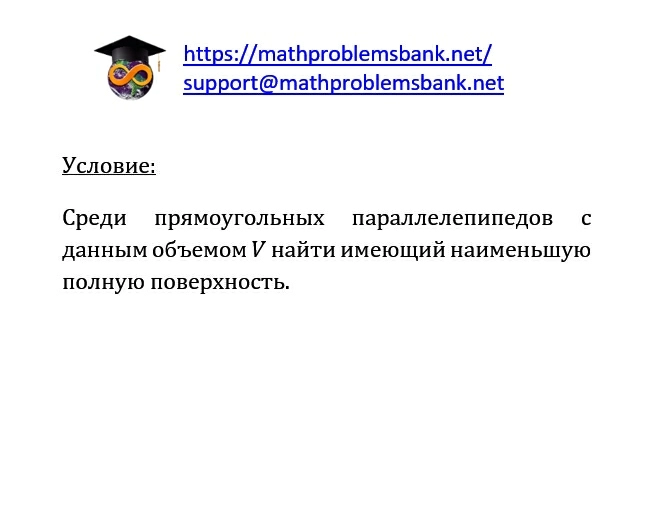 условие: Среди прямоугольных параллелепипедов с данным объемом \( V \) найти имеющий наименьшую полную поверхность.