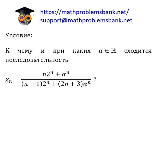 Условие: К чему и при каких \( \alpha \in \mathbb{R} \) сходится последовательность \[ x_{n}=\frac{n 2^{n}+\alpha^{n}}{(n+1) 2^{n}+(2 n+3) \alpha^{n}} ? \]