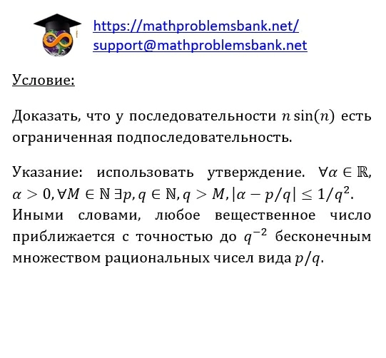 Условие: Доказать, что у последовательности \( n \sin (n) \) есть ограниченная подпоследовательность. Указание: использовать утверждение. \( \forall \alpha \in \mathbb{R} \), \( \alpha>0, \forall M \in \mathbb{N} \exists p, q \in \mathbb{N}, q>M,|\alpha-p / q| \leq 1 / q^{2} \). Иными словами, любое вещественное число приближается с точностью до \( q^{-2} \) бесконечным множеством рациональных чисел вида \( p / q \).