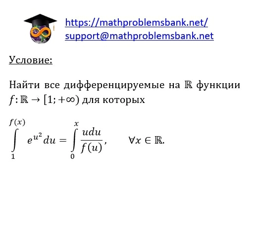 Условие: Найти все дифференцируемые на \( \mathbb{R} \) функции \( f: \mathbb{R} \rightarrow[1 ;+\infty) \) для которых \[ \int_{1}^{f(x)} e^{u^{2}} d u=\int_{0}^{x} \frac{u d u}{f(u)}, \quad \forall x \in \mathbb{R} \]