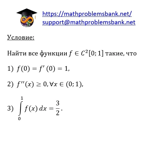 условие: Найти все функции \( f \in C^{2}[0 ; 1] \) такие, что 1) \( f(0)=f^{\prime}(0)=1 \) 2) \( f^{\prime \prime}(x) \geq 0, \forall x \in(0 ; 1) \), 3) \( \int_{0}^{1} f(x) d x=\frac{3}{2} \).