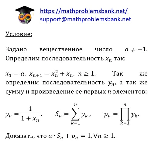 \( \underline{\mathrm{y}_{\text {словие: }}} \) Задано вещественное число \( a \neq-1 \). Определим последовательность \( x_{n} \) так: \( x_{1}=a, x_{n+1}=x_{n}^{2}+x_{n}, n \geq 1 \). Так же определим последовательность \( y_{n} \), а так же сумму и произведение ее первых \( n \) элементов: \( y_{n}=\frac{1}{1+x_{n}}, \quad S_{n}=\sum_{k=1}^{n} y_{k}, \quad p_{n}=\prod_{k=1}^{n} y_{k} \). Доказать, что \( a \cdot S_{n}+p_{n}=1, \forall n \geq 1 \).