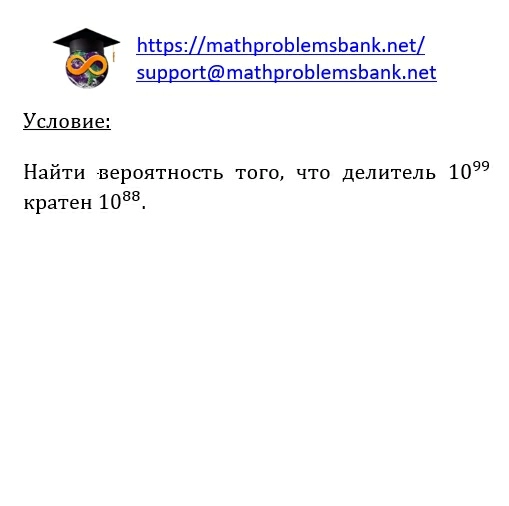 \( \underline{\text { Условие: }} \) Найти вероятность того, что делитель \( 10^{99} \) кратен \( 10^{88} \).