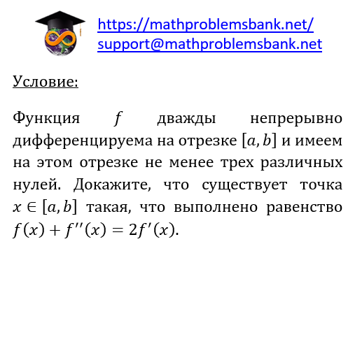 условие: Функция \( f \) дважды непрерывно дифференцируема на отрезке \( [a, b] \) и имеем на этом отрезке не менее трех различных нулей. Докажите, что существует точка \( x \in[a, b] \) такая, что выполнено равенство \( f(x)+f^{\prime \prime}(x)=2 f^{\prime}(x) \)