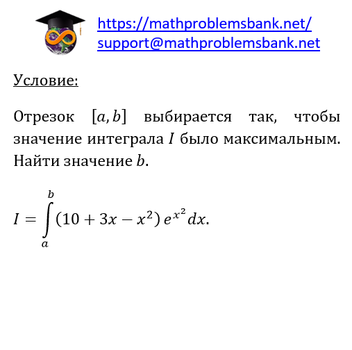 Yсловие: Отрезок \( [a, b] \) выбирается так, чтобы значение интеграла \( I \) было максимальным. Найти значение \( b \). \[ I=\int_{a}^{b}\left(10+3 x-x^{2}\right) e^{x^{2}} d x \]