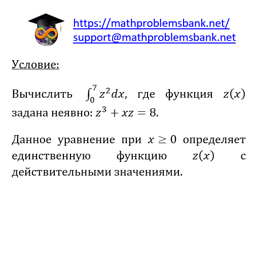 Условие: Вычислить \( \int_{0}^{7} z^{2} d x \), где функция \( z(x) \) задана неявно: \( z^{3}+x z=8 \). Данное уравнение при \( x \geq 0 \) определяет единственную функцию \( z(x) \quad \) с действительными значениями.