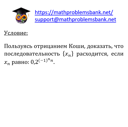 условие: Пользуясь отрицанием Коши, доказать, что последовательность \( \left\{x_{n}\right\} \) расходится, если \( x_{n} \) равно: \( 0,2^{(-1)^{n} n} \).