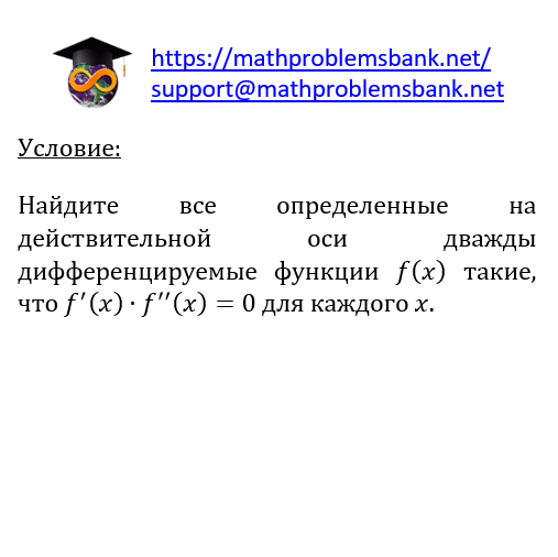 Условие: Найдите все определенные на действительной оси дважды дифференцируемые функции \( f(x) \) такие, что \( f^{\prime}(x) \cdot f^{\prime \prime}(x)=0 \) для каждого \( x \).