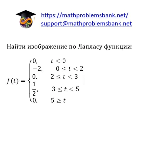 Найти изображение по Лапласу функции: \[ f(t)=\left\{\begin{array}{lc} 0, & t<0 \\ -2, & 0 \leq t<2 \\ 0, & 2 \leq t<3 \\ \frac{1}{2}, & 3 \leq t<5 \\ 0, & 5 \geq t \end{array}\right. \]