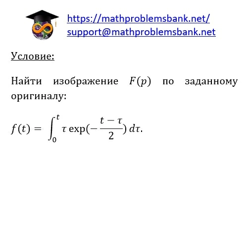 Условие: Найти изображение \( F(p) \) по заданному оригиналу: \[ f(t)=\int_{0}^{t} \tau \exp \left(-\frac{t-\tau}{2}\right) d \tau \]