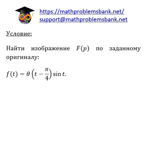 Условие: Найти изображение \( F(p) \) по заданному оригиналу: \[ f(t)=\theta\left(t-\frac{\pi}{4}\right) \sin t \]