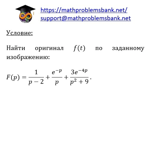 Условие: Найти оригинал \( f(t) \) по заданному изображению: \[ F(p)=\frac{1}{p-2}+\frac{e^{-p}}{p}+\frac{3 e^{-4 p}}{p^{2}+9} \]