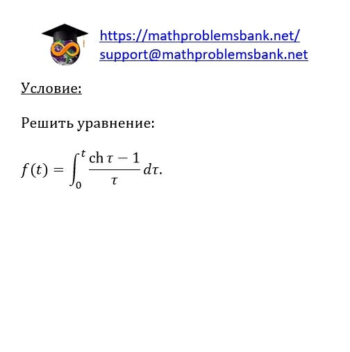 Условие: Решить уравнение: \[ f(t)=\int_{0}^{t} \frac{\operatorname{ch} \tau-1}{\tau} d \tau \]