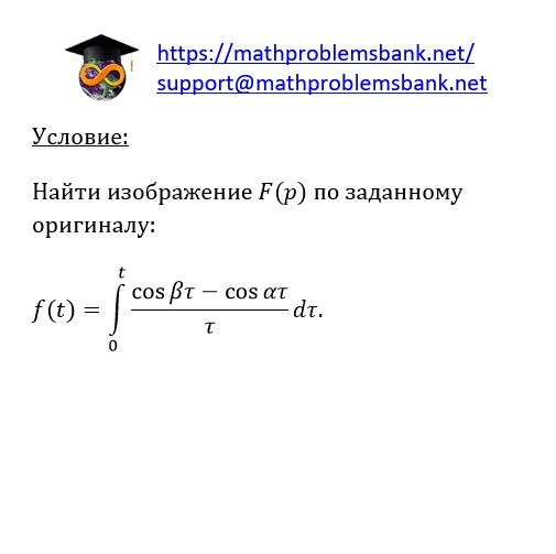 условие: Найти изображение \( F(p) \) по заданному оригиналу: \[ f(t)=\int_{0}^{t} \frac{\cos \beta \tau-\cos \alpha \tau}{\tau} d \tau \]